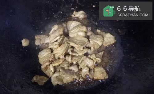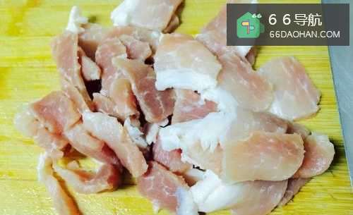 2接下来将前腿肉切成肉片,锅烧热之后加入少许油,油热了之后把肉片倒进去翻炒,炒至肉片发白即可。