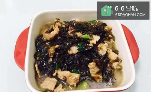 6最后一步就是将做好的紫菜炒肉片装盘端上桌享用啦!