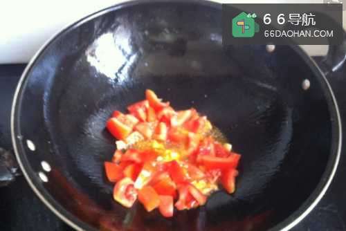 4将蒜头放入油锅炒香,放入切好的番茄丁翻炒,加入一点清水和少许盐进行调味