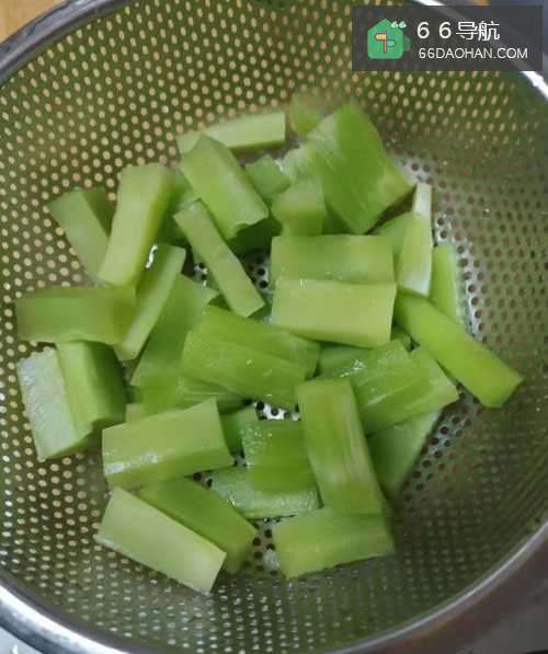 2青笋(莴笋)去皮,切成块,快速过水后冷却晾水备用。