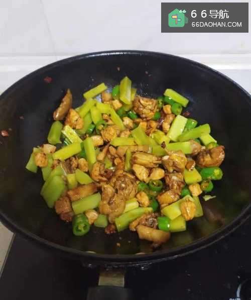 7加入青笋块,快速翻炒均匀后焖1分钟左右