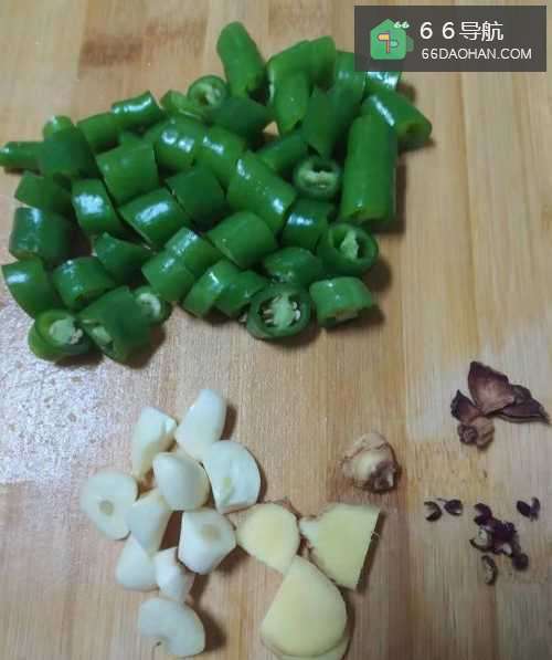 姜蒜切成小块,青椒切成小段。