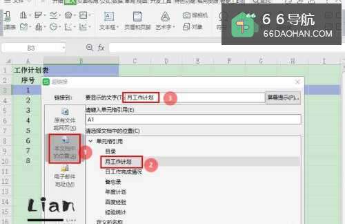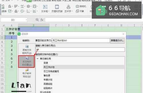 1、首先,打开WPS Office Excel数据表格;2、选择单元格【B3】,点击【插入】—【超链接】;3、在【超链接】窗口,选择【本文档中的位置】;4、在“文档中的位置”列表中,选择【月工作计划】,修改【要显示的文字】,然后点击【确定】;