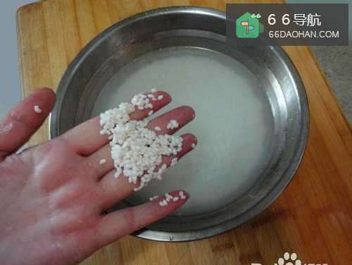 我们首先选择圆粒江米,用水洗净,泡上两个小时
