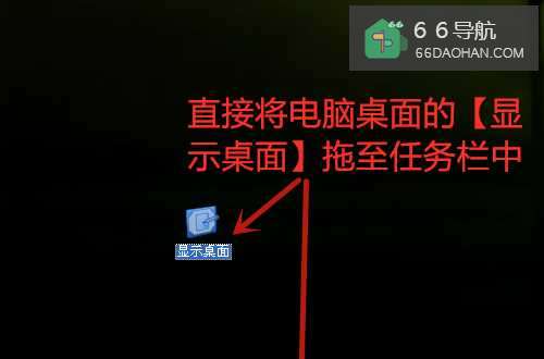 找到电脑桌面上的【显示桌面】图标,鼠标点击按住,直接拖至任务栏中。