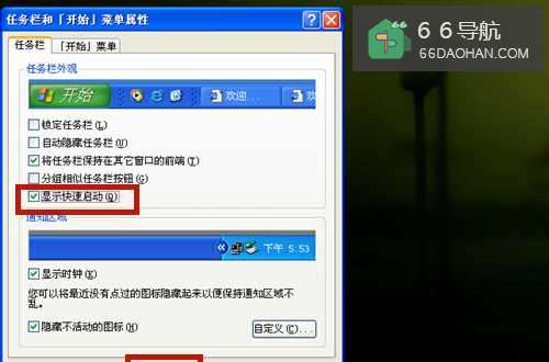7在【任务栏】的选项中,勾选【显示快速启动】。
