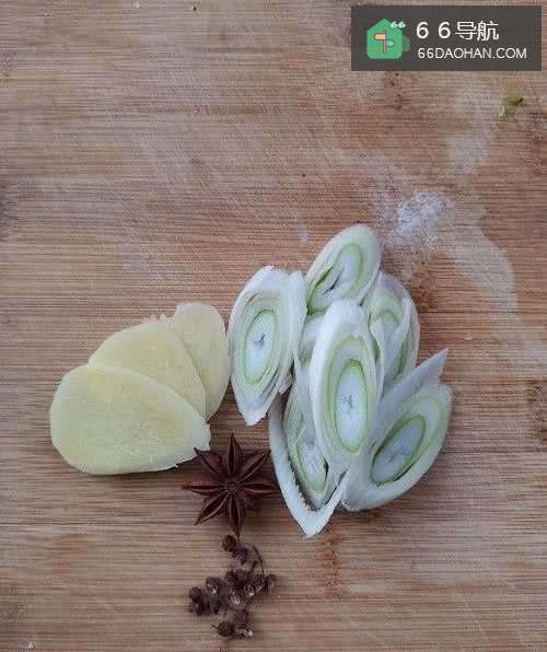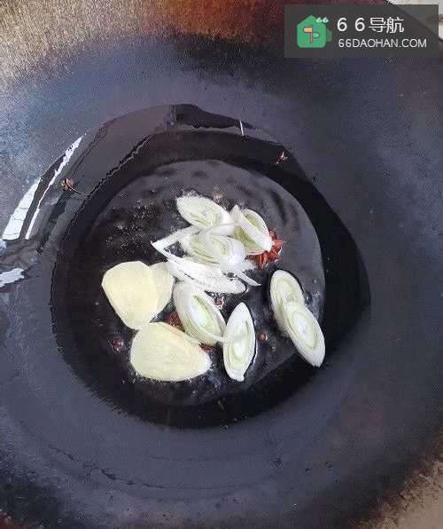 4取炒锅开火,热锅凉油,下入大料花椒烹香,再下入葱姜片爆香。