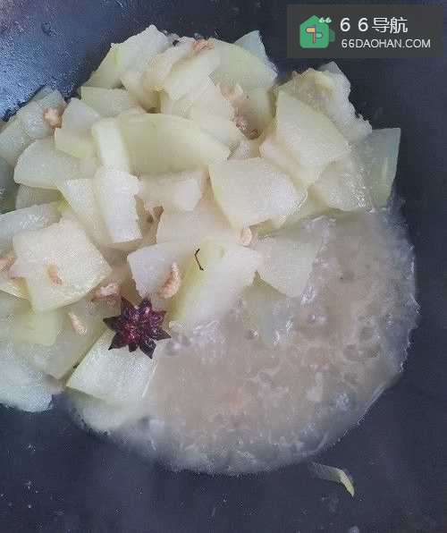 6冬瓜片炒好后,加入温水,水的量在菜的五分之四的高度,看下图。