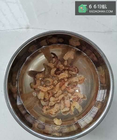 找一个小的不锈钢容器,先用凉水把海米泡上。