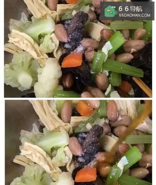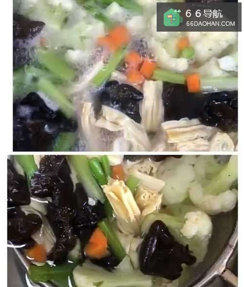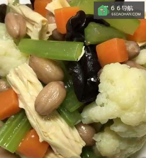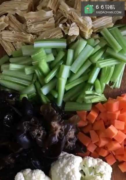 3腐竹、芹菜洗净切段;胡萝卜洗净切丁;木耳事先泡好洗净,撕成小块;花菜洗净,摘成小块。