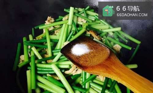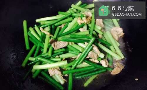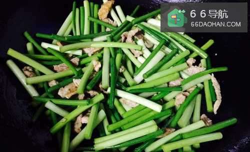 3肉丝炒好之后把洗干净沥干水分的蒜苗倒进去开大火翻炒2分钟左右!