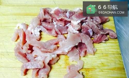 首先把买回来的猪肉切成肉丝状备用,蒜苗洗干净切成段备用!肉丝可以选择后退肉,也可以买现成的!