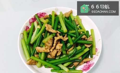 6最后一步就是将炒好的蒜苗炒肉丝装盘端上桌享用啦!