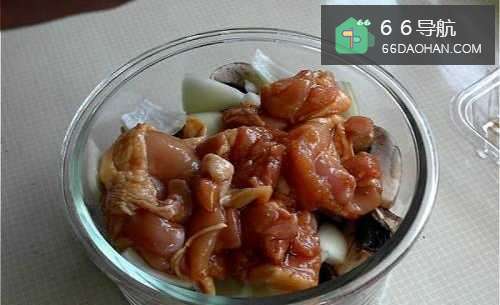 3取一容器,波特菇、洋葱铺底,鸡腿排放上面。