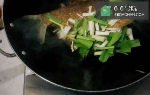 4汤汁煮至略少,倒入青蒜。