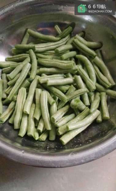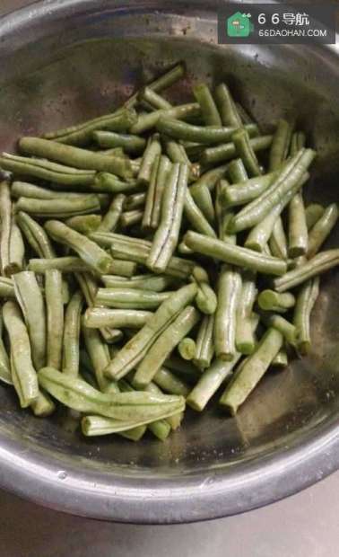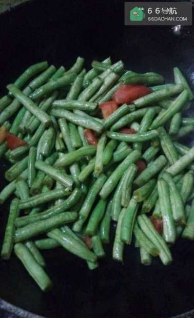 4热锅热油,同时放入腌制好的无丝豆和西红柿。