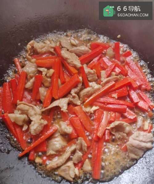 7倒入胡萝卜和腌制好的瘦肉,翻炒均匀,加入适量清水,转中火焖约10分钟