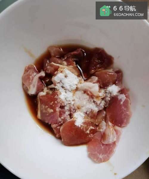 4瘦肉切片,加入适量淀粉,盐、生抽和蚝油,翻拌均匀腌制约10分钟