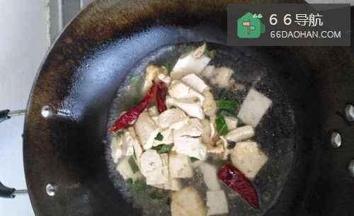 4当闻到豆腐被炸出来的香味后,咱们倒入水,放入辣椒和酱油。