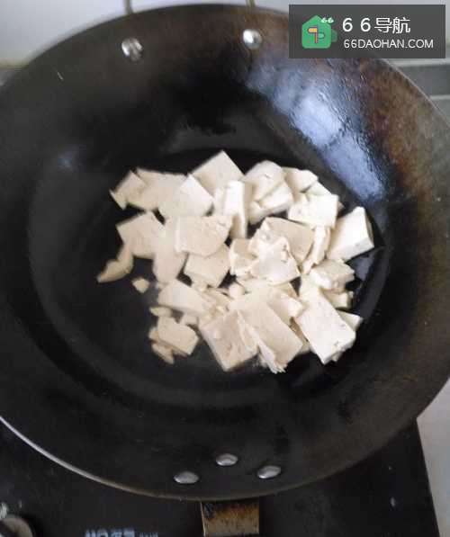 2食材准备好,开锅倒油,然后就把豆腐也倒入锅里,不用看油热不热。