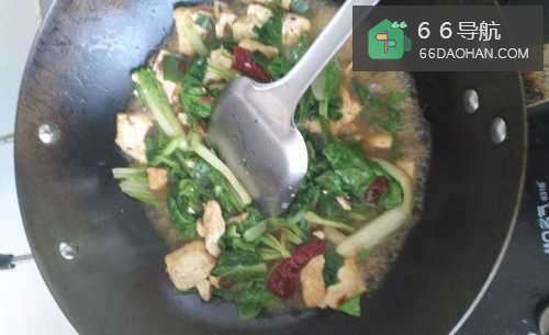 5大火煮开带汤的豆腐,把青菜倒入锅内,不需要翻炒。