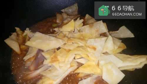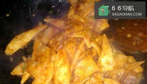 6翻炒烙饼,将辣椒酱汤汁与烙饼炒的均匀,并且把饼炒的松软受热,就可以装盘出锅了。