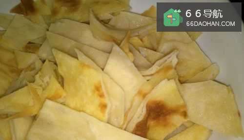 先把烙饼切成菱形块状的模样,然后收纳备用。