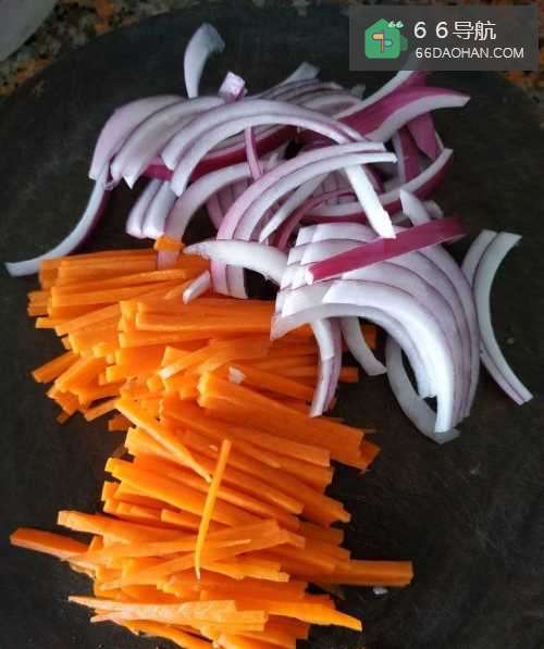 3胡萝卜取适量切丝备用,洋葱适量切丝备用,蒜粒切丝备用。