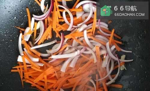 5加适量油加热后先将胡萝卜洋葱炒至5成熟。
