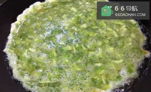 4平底锅刷一点油,锅烧热之后,转中火把苦瓜蛋液倒进去,轻轻晃动锅,让蛋液均匀平铺在锅里面!