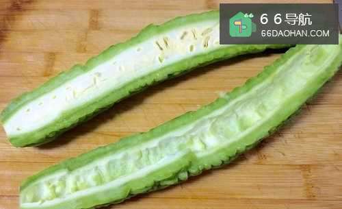 首先把苦瓜洗干净后去头尾,然后从中间一分为二,挖空苦瓜籽,然后切成沫备用!