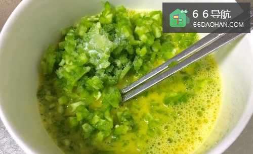 3鸡蛋液打好之后就把切成沫的苦瓜倒进碗里,用筷子搅拌均匀,还可以加入适量现磨黑胡椒碎和火腿肠,这个随个人喜好!