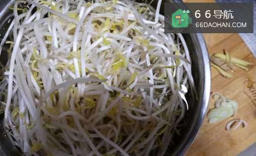 将绿豆芽用清水浸泡洗净,切好葱花和姜丝备用。