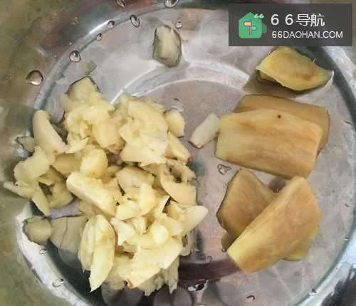 2准备一些姜蒜,再把圆白菜洗净,切成适当大小,如下图。