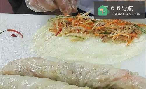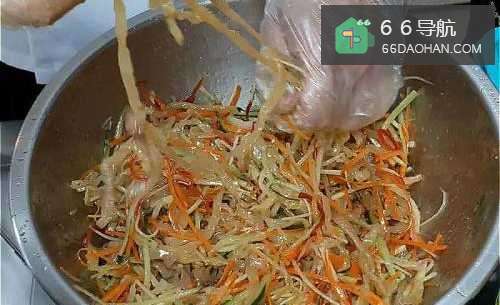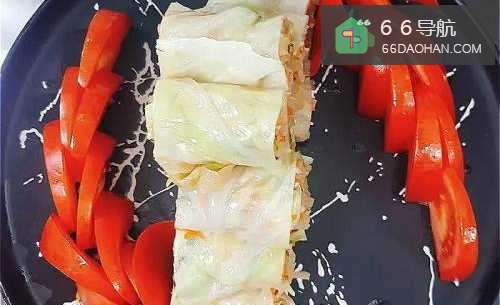 包心菜拿来包凉拌好的海蜇皮,再加入胡萝卜丝、小黄瓜丝、姜丝,一起卷起来,清爽不油腻,非常美味。