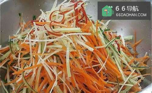 2将凉拌好的海蜇皮和胡萝卜丝、小黄瓜丝、姜丝、辣椒丝放在一起。
