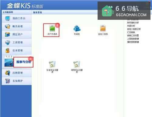 在功能选项菜单,单击【报表与分析】【资产负债表】;