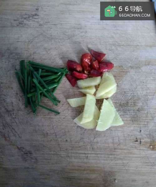 2将姜片切碎,辣椒切碎,小葱切成小段