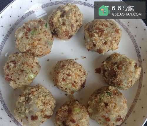 5将土豆泥搓成小丸子,并裹上面包糠摆在盘中备用;热锅倒入适量的食用油,将土豆丸子放入炸锅中炸成表面金黄沥干油捞出,点上沙拉酱就可以开吃了。