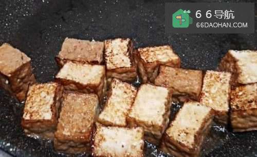 2先倒1大匙蒜风味油入锅,待油纹出现,放入卤豆腐,将白色的切面切至稍微金黄,捞出备用。