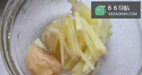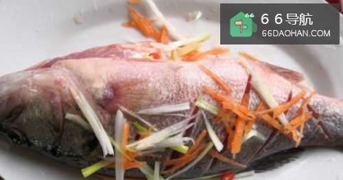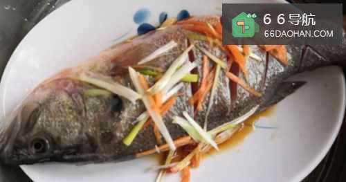 5将鲈鱼放在盘子里面,倒上一些生抽,鱼肚子里面塞上生姜丝和胡萝卜丝,在鱼身体上面也放上一些生姜丝和胡萝卜丝,见下图展示。