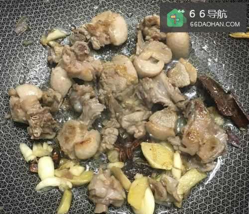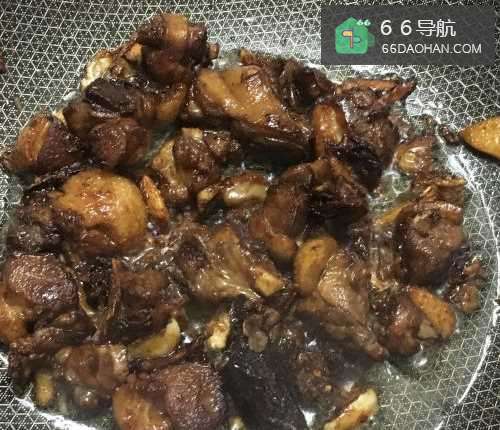 5然后放入鸭肉块,慢慢将其炒至表面有点焦黄,注意炒久一点,把鸭肉里面的水分炒出来,鸭油也煎炒出一些,就是要让鸭肉干燥一些,可以去腥。