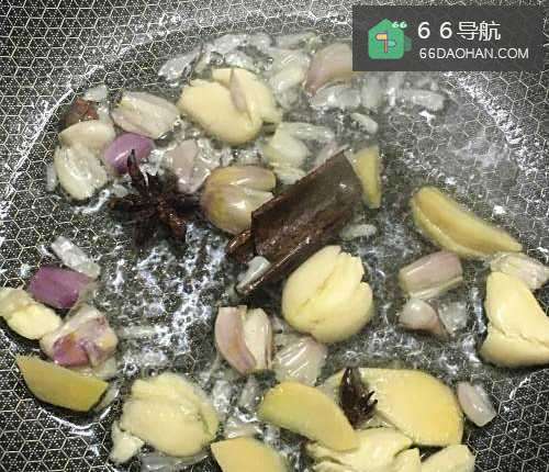 4、锅热油炒香姜葱蒜、桂皮、八角;