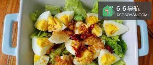 4将鸡蛋煮熟剥壳切成小块码放在切好的生菜上。