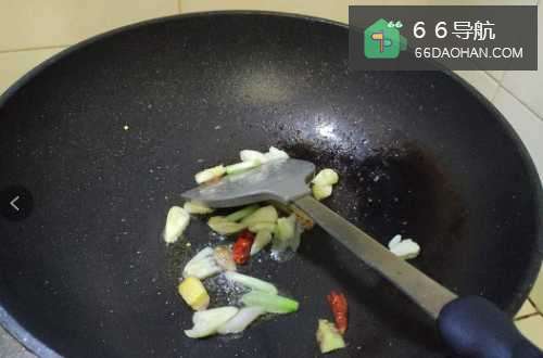 4将茄子起锅,加入油后放入蒜头、姜片、葱头、辣椒翻炒出香味,如图