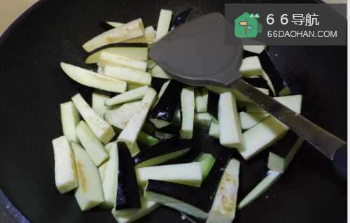 3锅里加入油后放入茄子,将茄子炒软,如图