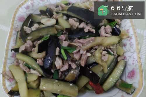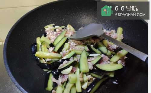 5加入猪肉翻炒一会后加入茄子翻炒,如图