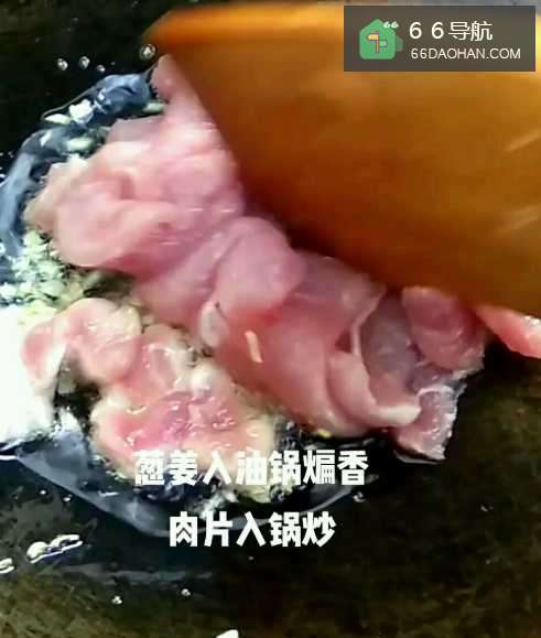 5将葱和姜放入平锅中搅拌,然后将肉炒。