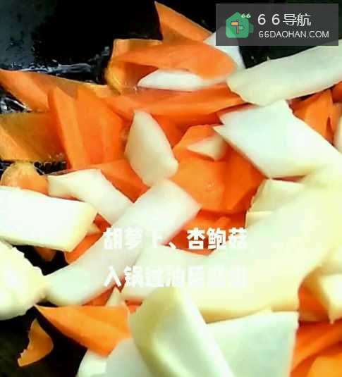 4拿起平底锅,将胡萝卜和杏鲍菇放入锅中,即可食用。