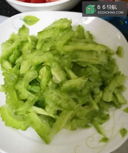 3这时,时间到了,将浸泡好的苦瓜清洗两边,捞出来放在碟子里。